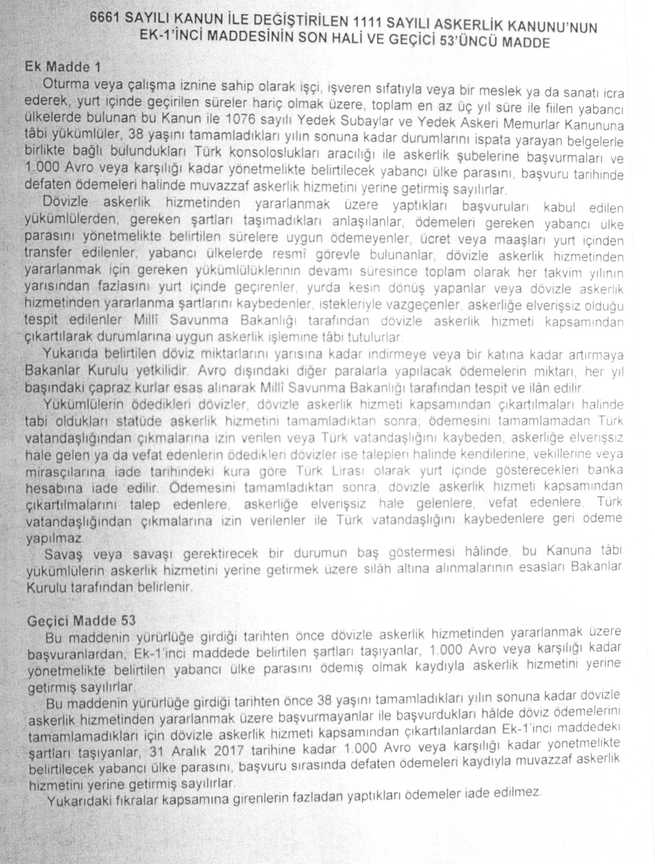 Bu kişiler, dövizle askerlik şartlarını haiz olmaları kaydıyla, en geç 31 Aralık 2017 (dahil) tarihine kadar 1000 Avro ödeyerek başvurularını yapabilirler.