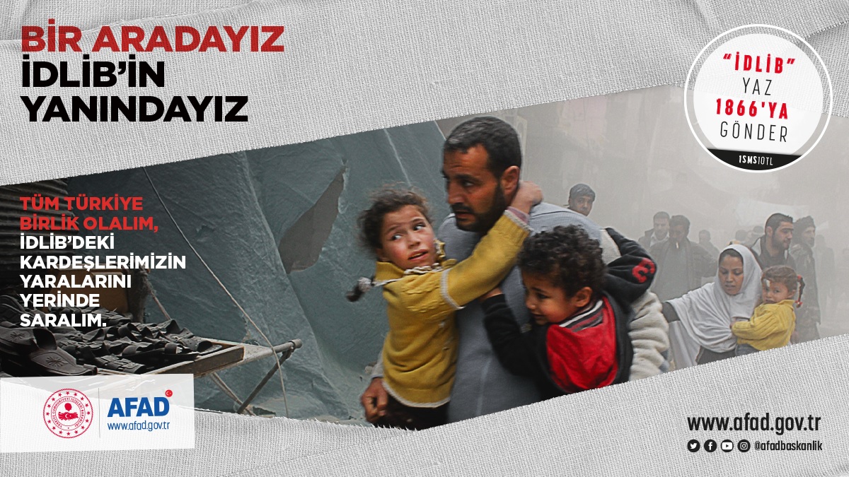 AFAD Başkanlığı tarafından Türkiye Kızılay Derneği ve Türkiye Diyanet Vakfı’nın yanısıra çeşitli sivil toplum kuruluşlarıyla işbirliği içinde İdlib’e yönelik “Bir aradayız, İdlib’in yanındayız” temalı insani yardım kampanyası başlatılmıştır.