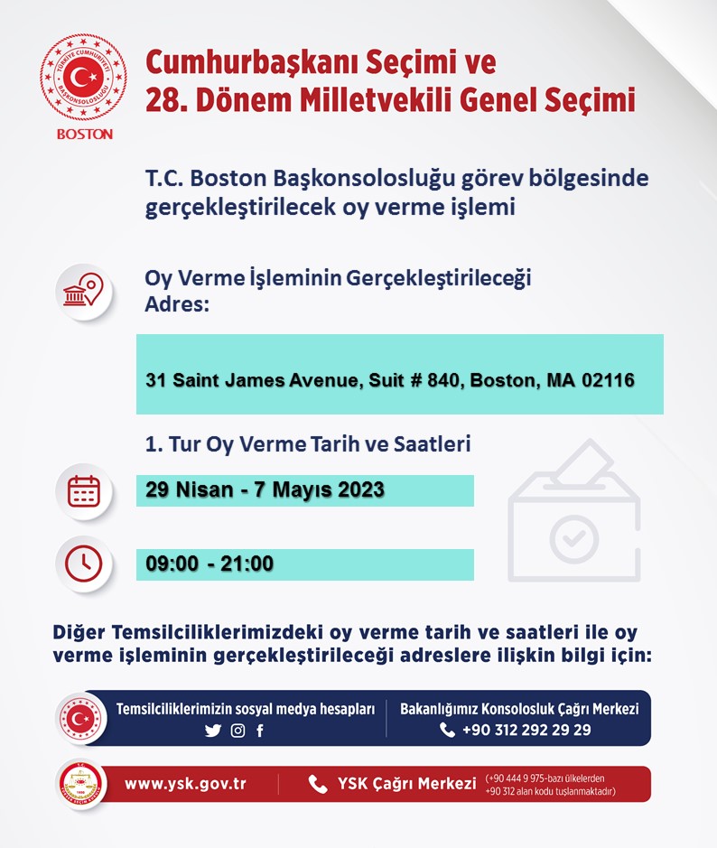Cumhurbaşkanı Seçimi ve 28. Dönem Milletvekili Genel Seçimi için Başkonsolosluğumuzda kurulacak sandıkların adresleri ile sözkonusu sandıklardaki oy verme tarih ve saatlerine ilişkin duyurumuza aşağıdaki bağlantıdan erişilebilmektedir.